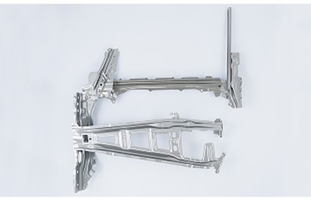 ■「車 体」(ドアサッシュ(写真中央)他):ロールフォーミング成形や高張力鋼板に対応したプレス成形技術、さらには多様な溶接技術を駆使し、車両の軽量化という重要な課題に取り組んでいます。この分野における長年の知見と技術力を活かし、パートナー企業と連携しながら、さらなる軽量化技術の革新に挑戦しています。