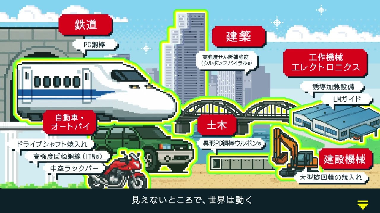 また土木・建築分野においては、高強度PC(プレストレスト・コンクリート:コンクリートにあらかじめ応力を与えておくことで、引張力に弱い性質を改善する技術)鋼棒「ウルボン」を開発しました。国内で高いシェアを誇るこの製品は、橋梁や超高層ビルといった現代社会を支える重要インフラの長寿命化に欠かせない存在となっています。さらに、このPC鋼棒は鉄道の枕木にも採用されており、新幹線をはじめとする世界中の鉄道の安全性と安定運行を支え、人々の快適な移動を支えています。